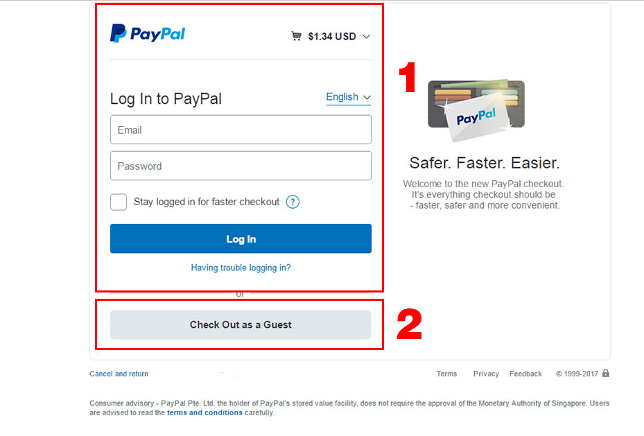 2. If you want to pay by credit card, please click on the Check Out as a Guest. Fill the your card and then press the button. Pay to make payment.